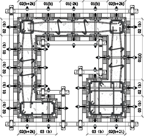 图中宽度标注中的序号“01”、“02”、“03”分别代表“阴板”、“阳板”、“中板”,括号内的“b”表示为隶属于序号板的所有宽度规格尺寸,其中“b+2k”表示为阳板的加码面,“b-2k”表示为阴板的减码面,“01(z)”表示为阴板的自制(非标规格仿制)板。上图采用了纵向(y 轴)“规格面对齐”区段统一;横向(x 轴)“其他面入槽”区段统一。“区段统一”是指一个相对独立的区段,这个区段如果是在地下室(含外墙板)就会相当大,可以依后浇带为界,也可以通过设立“非标准”段来划分,施工时需要协调。