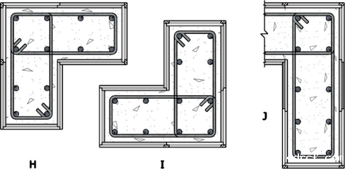 图 H、I 主要为单块中板完成的“L”形柱阴阳面段的拼模,由于中板两面均为“规格面”在拼模时,只要是选择了横(x)向“规格面对齐”,那么纵(y)向的中板就“入槽”;其中 H 图采用了横向对齐,I 图采用了纵向。
