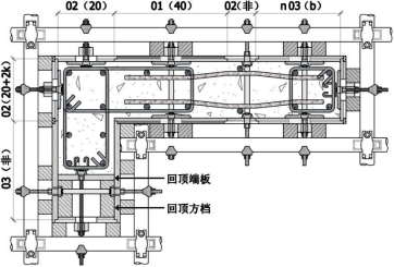 [注]:图中表示方式及拼模时应注意的事项同前,纵向“03(非)”段,所采用的“体外对拉”及“单边拉结”均按照“自制板”应采用“顶托”替代“内顶盖”,“单拉锚固”螺杆适用于柱端砌墙段,可方便安装墙体拉结筋(参见上图)。横向“阴阳面”采用“02(非)的组合,当“02(非)”宽度大于 10cm 时需设置对拉螺杆。图中其他表示方式及拼模方法同前,其中括号内的“40”“20”为隶属序号板的具体规格(厘米),“20+2k”表示为“加码面”尺寸。