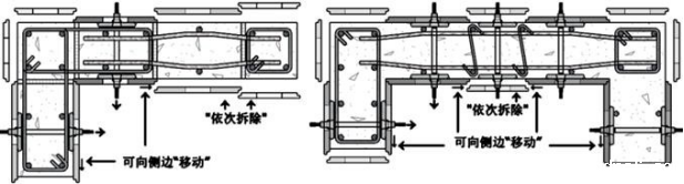 (2)双拆条件”:当“依次拆模”到阴角时,组成阴角(90º)的两块模板在宽度方向同时均有可向“侧边”移动的“空间”(见之下的“可向侧边移动”参考图)。