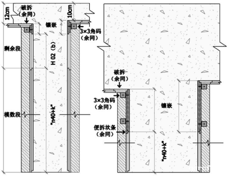 当高度拼模到 n40+k(模数段)且离板底(梁底)约 26~66cm 时,可把阳板宽度当作高度来拼模,用“H02(b)”来表示(见图),并把“横铺板”作为模板高度方向拆模的“起始板”;另外这里也可以采用“阴板横铺”只是需要将减码面朝向砼。“便拆坎条”:当高度拼模到 n40+k(模数段)且离板底(梁底)约26~66cm 时,无法采用“阳板横铺”时,可直接采用“镶坎”,但模数段与镶坎段间需设置“便拆坎条”,使模数段的最上一块模板能成为模板高度方向拆模的“起始板”(见图)。
